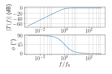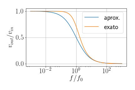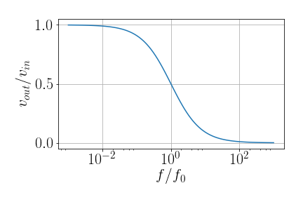 - Atenuação de 3 dB \([\log(|v_{out}|/|v_{in}|)=\log(1/2)=-3\,\text{dB}]\) em \[f_{3dB}=\frac{1}{2\pi RC}\]